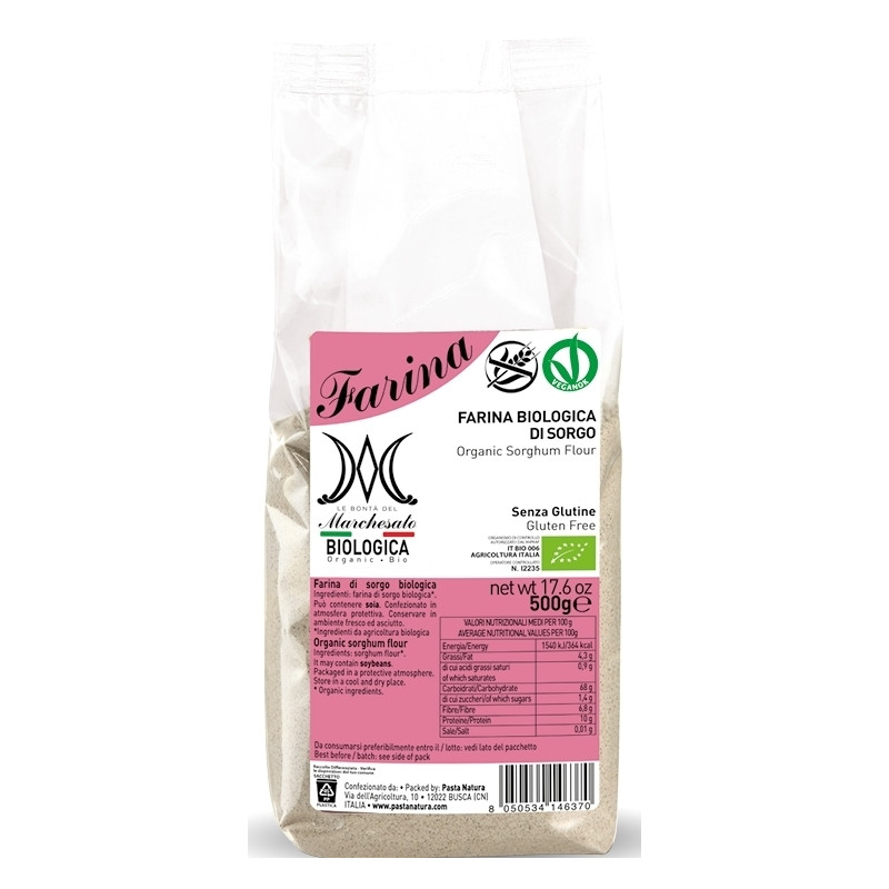 Daca doriti sa incepeti sa pregatiti paine buna de casa fara gluten, alegeti faina de sorg organica de la Marchesato. Aroma sa neutra o face perfecta pentru o varietate de utilizari: nu ar trebui sa lipseasca niciodata din camara daca va place sa pregatiti mancaruri excelente, gustoase si sanatoase, fara gluten. Folositi-o pentru a face aluaturi rustice, dar nu granuloase, asa cum ar fi cu faina integrala macinata grosier. Fara indoiala, este un ingredient de incercat daca nu il cunosti inca. Macinarea fina a fainii de sorg este perfecta pentru amestecuri de prajituri, gogosi, si clatite.