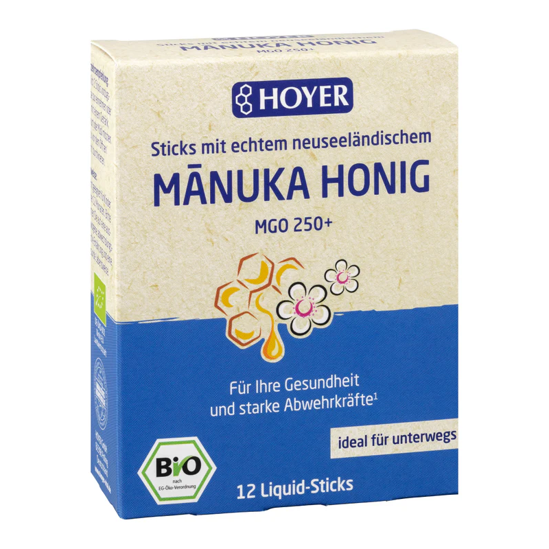 Mierea de Manuka in doze Hoyer este usor de luat la birou sau in calatorii, un pachet contine 12 pliculete de miere de Manuka bio cu factor MGO de 250+.