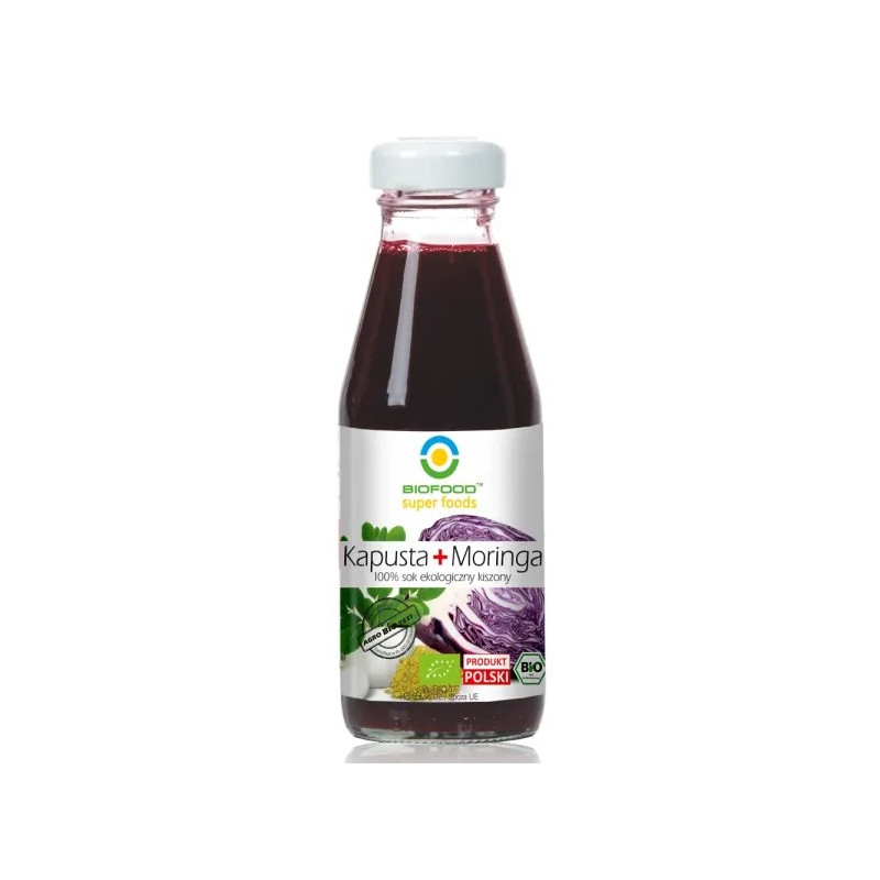 Suc de varza rosie lactofermentata si moringa: NFC - presat, nu din concentrat, produs pasteurizat. Fara gluten. Fara OMG.